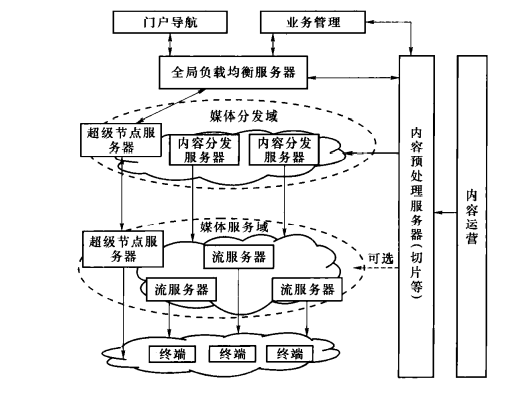 超级节点服务器完成的功能有:内容分发策略、域间/域内查询、节点/拓扑管理等;内容分发服务器完成内容存储与控制功能、内容分发功能;