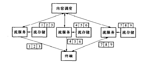 在分布式流服务中JPTV终端的内容服务不只是由一个流服务器完成的,而是多个流服务器共同完成。内容的调度控制节点按照每个流服务节点的负载情况和内容切片的分布情况指定一个合适的流服务节点为每一个视频终端服务。一般情况下,流服务节点从本地的边缘存储节点获取开始的内容分片并向用户提供流服务,如果本地的边缘存储节点没有存储其余的内容分片,它可以向更高级别的存储节点获得。这样就极大地避免了内容在流服务器之间的复制,减小了网络流量。