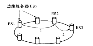 在普通节点网络中,每个边缘服务器保存一部分内容索引/边缘服务器信息(key/value对),通过P2P算法,接收到用户请求的边缘服务器从本地开始经过有限的跳数找到内容索引,从而找到存储内容的边缘服务器。用户请求某一内容,此内容索引保存在ES3上。首先,用户请求ES4.ES4査找自己保存的内容索弓I,没有找到该内容索引,然后ES4査找自己保存的边缘服务器信息,判断ES5可能保存此内容索引,ES4请求ES5进行内容索引查找;ES5执行与ES4一致的操作后发现找不到内容索引,请求ES3;ES3执行内容索引查找后,确定自己保存此内容索引,给用户返回此内容索引对应的边缘服务器信息。