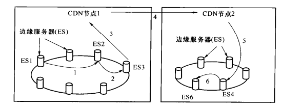 査找内容的边缘服务器首先在普通节点网络中査找内容索引,如果找不到,再通过P2P算法,在超级节点网络中查找与该内容对应的超级节点,此超级节点在其普通节点网络中选择最优的边缘服务器向用户提供流服务。用户请求某一内容,此内容索引保存在CDN节点2的ES6上。首先,用户请求ES7,ES7在普通节点网络中查找该内容(过程同(1)中相关的内容),没有找到内容索引通知ES9(CDN节点3的超级节点服务器);ES9査找自己保存的超级节点信息,判断ES4CCDN节点2的超级节点服务器)可能保存此内容索引,ES9请求ES4进行内容索引査找;ES4执行内容索引査找后,确定自己保存此内容索引,在普通节点网络中査找该内容(过程同(1)中相关的内容)。