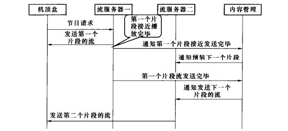 (2)流服务器一向机顶盒发送媒体流,当媒体流接近发送完毕时,通知媒体内容管理模块;