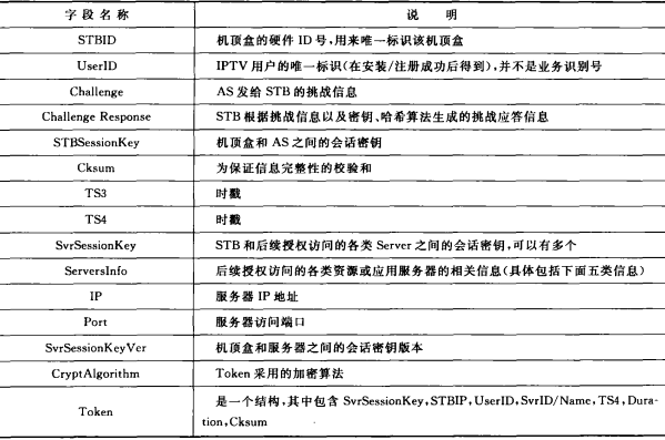 IPTV业务需要有较高的安全性,以防止各类攻击,包括窃听攻击、地址仿冒、重放攻击、破坏完整性攻击等。根据不同的网络模型,在应用层面上可以有多种认证鉴权方式:基于可管理网络模式的安全认证和基于开放互联网络模式的安全认证模型。可管理网络模式的安全认证机制比较简单,对设备和业务釆用分散的认证方式;下面介绍一种基于开放互联网络模式的安全认证机制,以供参考,如附图3-1所示。它是一种集中的安全认证机制,IPTV系统中的机顶盒和其他的功能服务器必须首先到统一的认证服务器进行认证,STB通过认证后,获得了后续将要访问的IPTV系统中各类服务器的token,如果STB要访问某个服务器,则必须带上相应的服务器token以及相关的防攻击措施,服务器在收到这些信息后则可以进行授权验证。下面介绍一下两个主要的消息交互流程及用到的参数。