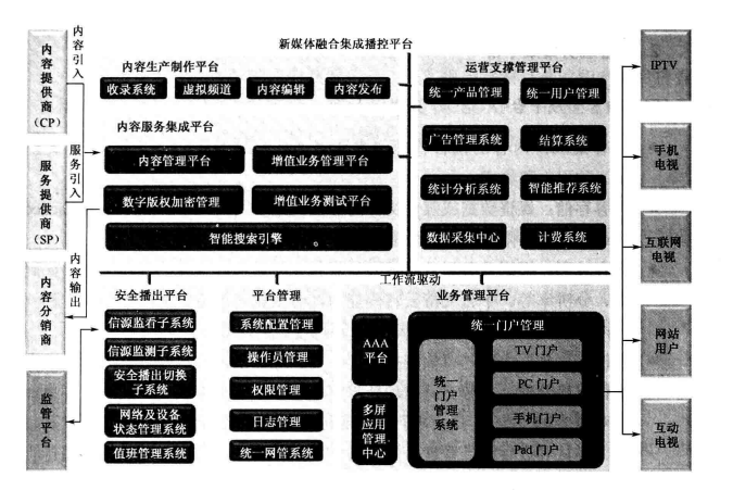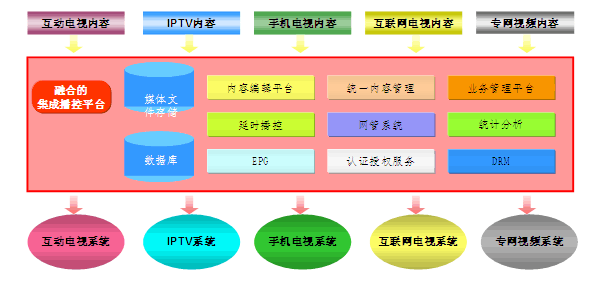 IPTV集成播控平台是在新媒体产业大发展的环境下,由广播电视机构负责内容播出的控制和管理平台,包括内容管理、鉴权管理、计费、用户管理等功能。